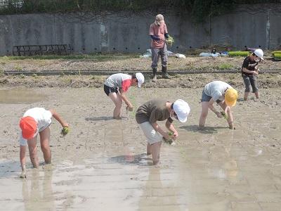 ほとんどの子が田んぼに入るのは初めてで カエルやヒルを見つけて大騒ぎしていましたが、泥んこになりながら夢中で苗を植えていました。