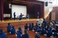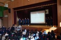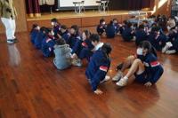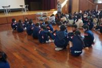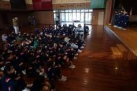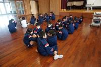 そして、「笑顔集会」。運営委員の児童が、いじめにつながる言葉や言い方について、発表とげきをしました。