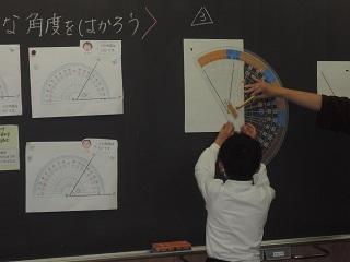 算数の「角の大きさ」の学習で、初めて分度器を使って角の大きさをはかりました。