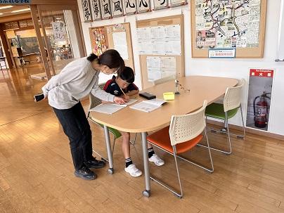 パフォーマンステストの横では、4年生が算数の課題に取り組んでいます。また、職員室前のテーブルでも算数の問題を解いている児童もいます。わからないときは先生に質問。