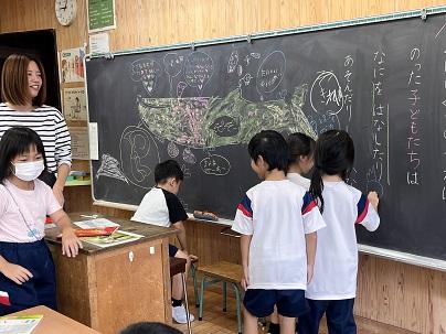 1年生は国語のくじらくもをイメージした絵を、黒板にみんなで描いていました。