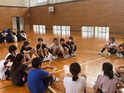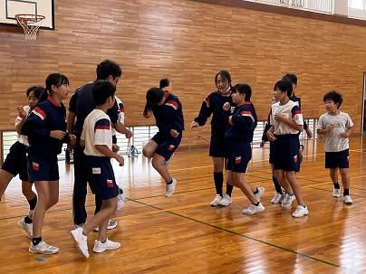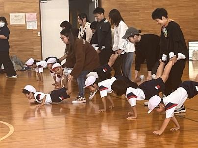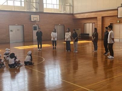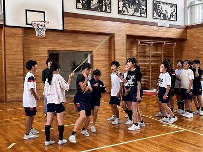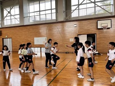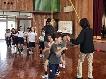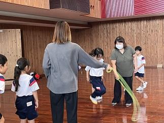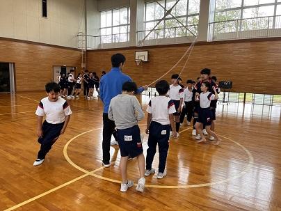 1,2年生は講堂で声を出して取り組んでいます。1学期に比べて、飛ぶ回数が増えてきましたね。