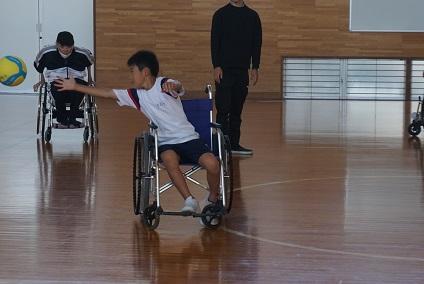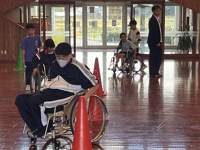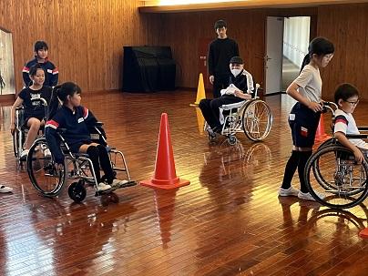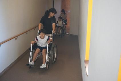 児童のみんなは、車いすに乗ってみました。いつもできることが、車いすに乗ってみるとなかなか難しいと気づきました。まっすぐ進むことも、1センチほどの段差を乗り越えることも大変でした。特にカーブが曲がりにくいことも知りました。