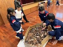 1年生の生活科の授業で、外で秋を見つけ、見つけた秋の自然なものを使ったおもちゃ作りをしました。落ち葉やどんぐり、椎の実、松ぼっくり、すすきなどを近くの神社などに行き、たくさん集めてきました。足りないことがわかると、市内や本校の先生たちが集めて持ってきてくれました。そして、それを使って、秋のおもちゃを作りました。