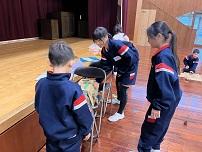 講師の錦城能楽会の皆さんから教えてもらい、グループに分かれた3,4年生が、仕舞、笛、小鼓、大鼓、太鼓の体験をしました。