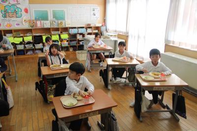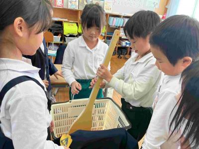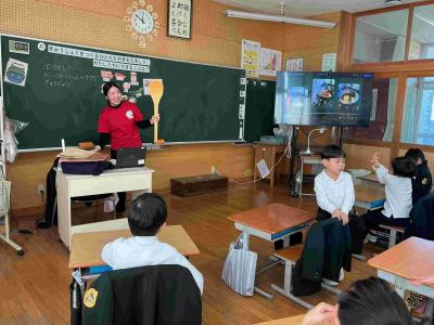 栄養教諭の先生を迎えて、1,2年生で、「給食を作る人の気持ちを知り、わたしたちのできることは」を考えました。調理員さんにも来ていただき、実際に作っている道具も見せてもらいました。家で使っているものよりも大きくてびっくり!!約90人分を作っているから大変ですね。