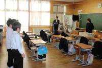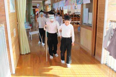 視覚障碍者の方の苦労や喜び、声のかけ方などの話を聞き、その後、アイマスク体験をしました。言葉で聞くよりも、実際に目が見えない状態で、何が怖いのか、何をしてくれるとうれしいのかを、体で実感しました。その後、点字や点字ブロックなども紹介してもらい、自分たちにできることは何かを考えるいい機会になりました。