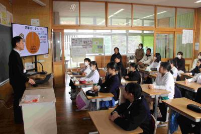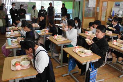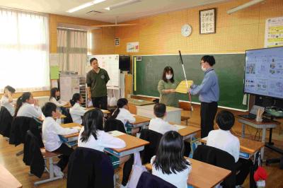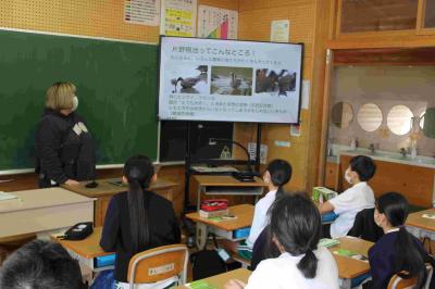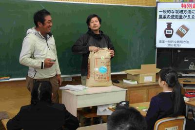 共生農業の理解の促進を目的として、加賀市の全小中学校の給食で、農薬不使用の特別栽培米「あぢの郷米 加賀のティール」が出ました。この米は、湖北の地元の方が作っていることもあり、4時間目に、かが有機農法研究会の方や、市役所、鴨池観察館のレンジャーが来て、お話をしてくれました。そのあと、ティール米を食べました。勉強した後なので、特においしかったです。