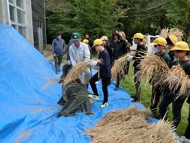 はさにかけて乾燥させていた稲の脱穀をしました。足ふみで回転させながら、穂先を当てて実を外していきます。教えていただきながら頑張ってできました。その後、田んぼでお世話になった方々に、感謝の気持ちを伝える感謝の会をしました。米作りに関わって感じたことを伝えられました。田植えから水の調整、草刈、稲刈り、脱穀といろいろな面でお世話いただいた皆様、本当にありがとうございます。