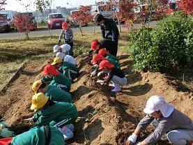 1,2年生がサツマイモ掘りをしました。JAの方に、途中で折れない取り方を教えていただき、さっそく掘り始めました。掘り始めるとすぐに立派なサツマイモが顔を出し、歓声が上がっていました。