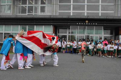 新保の獅子舞が、学校に来ました!!お祭りって感じでいいですね。中学生になると、獅子舞をしたり、太鼓や笛をしたりして、お祭りの中心になって活躍するんですね。獅子舞は、町ごとに違うので、おもしろいですね。