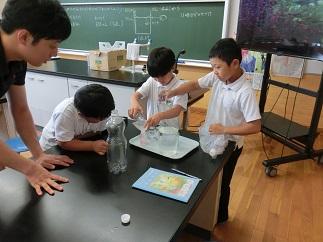 2年算数「水のかさをはかってあらわそう」の授業です。家から持ってきたいろいろな入れ物の水のかさを協力して調べていました。