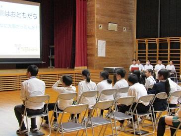 5年生が、赤ちゃんふれあい体験をしました。最初に吉田助産師さんから、赤ちゃんが生まれる前や生まれてからの様子について話を聞きました。その後、お招きしたお母さんと赤ちゃんに部屋に来ていただき、質問したり、近くで様子を見せていただいたりしました。とても貴重な体験をありがとうございました。