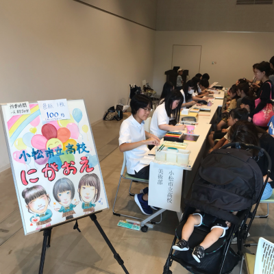 「どんどんまつり協力イベント」の催しの1つで、県内の高校が特技や専門性を活かして来場者を楽しませる企画でした。芸術コース美術専攻としては初参加のイベントでしたが、開始時間の前には既にたくさんのお客さんが集まっていました。その後、依頼は途切れることなく、生徒はほぼ休みなくフル稼働といった様子でした。