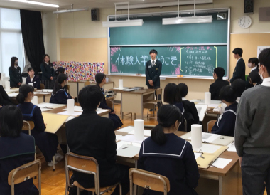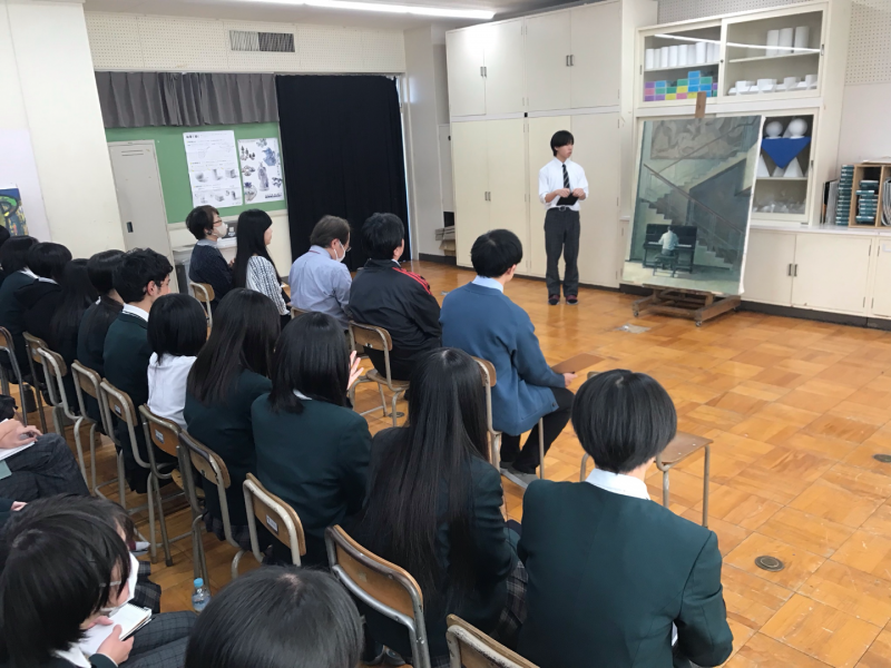 10月26日(日)、芸術コース体験入学が行われ、たくさんの中学生とその保護者の方に参加いただきました。美術専攻では、毎年2年生を中心とした在校生によるデッサン講習が行われており、中学生に近い目線による実習を行っています。短く限られた時間内での実習になるので、基本的な石膏幾何形体をモチーフに、形の見方や描き進め方などを中心に進められました。2年生は、この日のためにどう説明したらわかりやすいか、中学生に楽しんで描いてもらえるか、段取りや声掛けに工夫をしていました。