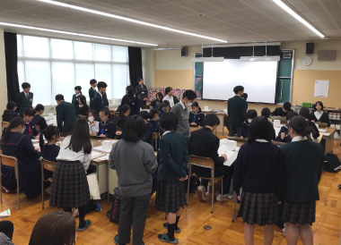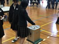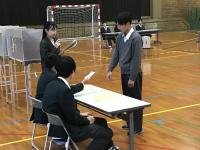 前半は新有権者に向けて選挙の仕組みや大切であることのお話を聞き、後半は実際の投票場の道具を用いて、選挙の体験をしました。仮の立候補者の公約が書かれた用紙もあり、生徒たちはどちらに投票するか熱心に読んでいました。また投票も特別な用紙で気づきを友達と話しながら、楽しんで投票を体験する様子が見られました。