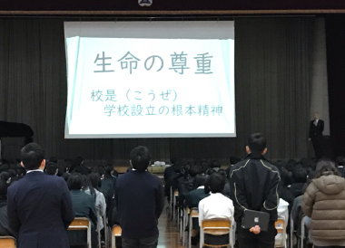 式辞で久保出校長は、エントランスホールに掲げられている校是「生命の尊重」について触れ、66年掲げられてきたこの精神を心に留めてほしいと話されました。
