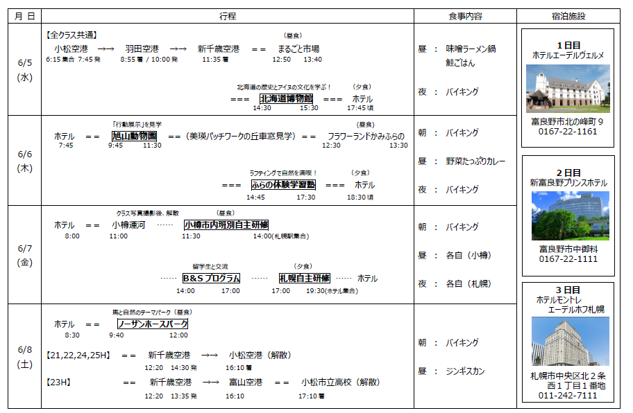 全員集合時間に遅れることなく、予定通りに小松空港を出発、スムーズな修学旅行のスタートを切ることができました。羽田空港経由で新千歳空港に到着しました。