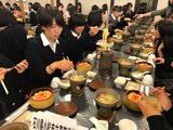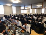朝早く出発しているためお腹をすかせていた生徒たちは、昼食の「鮭のそぼろ丼と鍋ラーメン」を美味しそうに食べていました。