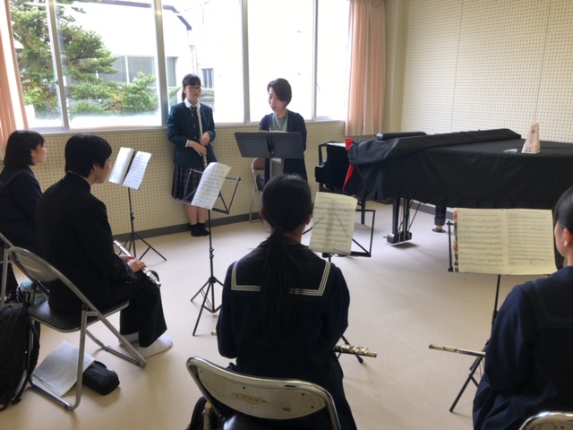 まずは在校生によるウェルカムコンサート(アンサンブル)から始まり、普通科音楽コースの分かりやすい説明の後、合唱と専攻楽器の体験レッスンをしました。