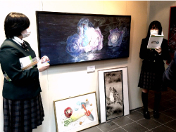 3年生最終登校日のこの日、本年度「卒展」最後の会場である本校エントランスホールが開始されました。本会場では、卒制2次制作として作られた作品も展示され、自由で華やかさが増した会場となりました。昼休みの時間にはギャラリートークが行われ、後輩や友人、先生方が集まり、作者の作品説明に聞き入っていました。