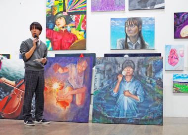 この日は金沢21世紀美術館で開催されていた「秋季高校生の美術展」の最終日で、受賞者の表彰式と作品講評会が行われました。作品講評会では、最優秀賞を受賞した仲林 冬眞君が作品「未完成」について制作意図や表現の工夫点などを説明しました。