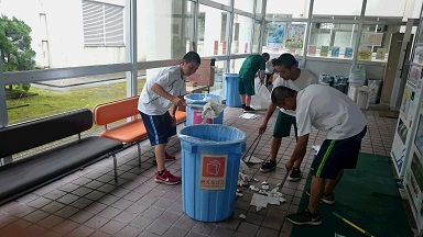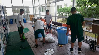 野球部では部室掃除の一環として、ピロティーのゴミの分別活動を行いました。