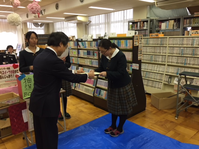 1月29日(月)昼休み、スタンプラリー抽選会の後、ベストリーダー賞(多読者賞)の6名に賞状と賞品を贈呈しました。当日は校長先生より授与。