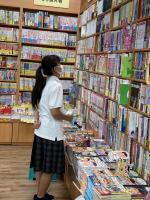 店員の方に説明を受けた後、まず、7月に行った全校読書アンケートでリクエストされた本を探し出し、その後、図書館にあったらよいと自分で思う本を選定しました。ただ、好きな本を手にとるだけではなく、「このリクエストの本は実際、見てみると学校の図書室にはふさわしくないのではないか?」などきちんと自分で判断し、探している図書委員を見て、とても頼もしく感じられました。