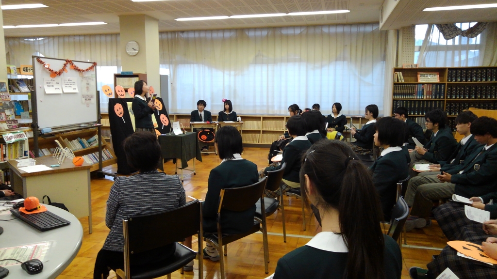 昨日放課後、図書館にて校内ビブリオバトル大会を開催しました。今回も図書室はハロウィン風に飾り付けをし、4人のバトラーがそれぞれイチオシ本を紹介、最後に一番読みたくなった本にギャラリー(来場者全員)が投票してチャンプ本が決まりました。