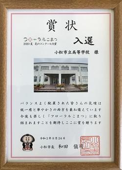 このホームページでも何度か玄関前の花壇について紹介しましたが、今回フローラル小松2020夏花のコンクール大賞に「入選」しました!バランスのよい配置と華やかさを評価していただきました。