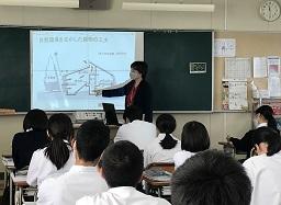 10月1日(木)高大連携クラスの12Hで、高大連携授業が行われました。金沢学院短期大学現代教養学科の河内久美子教授に、「住まいの環境工学」と題してお話しいただきました。快適な住まいに必要な室内気候の4要素について、科学的な側面から説明をしていただきました。自然環境を生かした建物の工夫は、SDGsの視点からも重要な考え方です。今後の進路選択の参考にもなる講演でした。ありがとうございました。