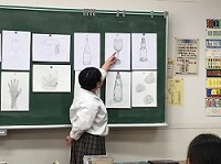 今回は加賀市立錦城中学校美術部にお邪魔しました。1~3年生の皆さんが描いたデッサンの講評を行いました。始めて描いたというものもありましたが、どれも一生懸命描かれたもので、講評する生徒も一枚一枚真剣に向き合いながらポイントをお伝えしました。