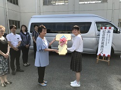 贈呈式では同窓会前川会長より挨拶をいただき、生徒を代表して生徒会長の丸君が御礼の言葉を返しました。ご寄贈いただきましたワゴン車は、本校の教育活動や部活動の移動の際に大切に使わせていただきます。