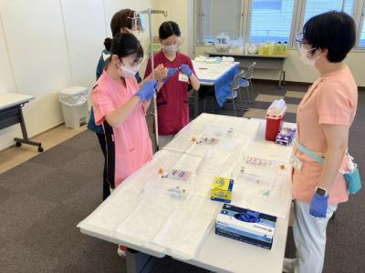 バイタルサインの測定や聴診、ミキシングと呼ばれる薬剤を混ぜる作業の体験をしました。
