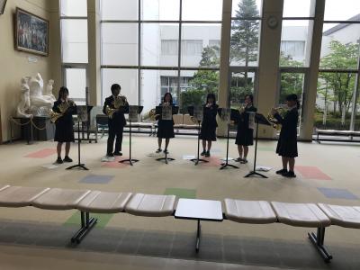 吹奏楽部の定期演奏会のPRを兼ねて、登校時ホールで演奏し生徒を出迎えます。