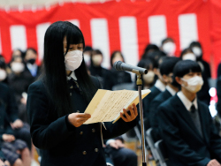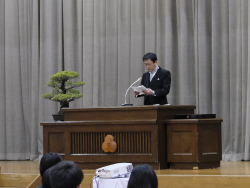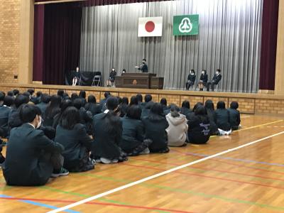 この日、今年度最後の行事となる表彰披露・終業式・離任式が執り行われました。終業式で学校長は「諦めないこと」と「目的を持つこと」について語り、新年度へ向け1,2年生を鼓舞しました。離任式では、この春で転勤、退職される教職員の方々から生徒たちへの最後のメッセージが送られました。