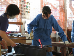この日、美術専攻1年生のガラス実習を吉野工芸の里 吉野谷ガラス工房 蕾さんで行ってきました。今年は、良い天気で気温も過ごしやすく紅葉も美しいベストコンディションの中での実習でした、その分工房内は暑い中での作業となりましたが、作品に対しても熱く頑張りました。