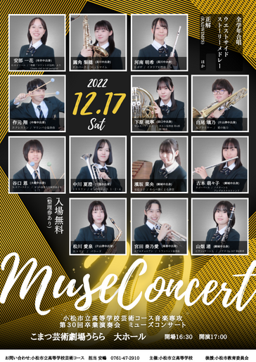 12月17日(土)こまつ芸術劇場うらら大ホールにて、音楽専攻生による卒業演奏会”ミューズコンサート”が開催されます!