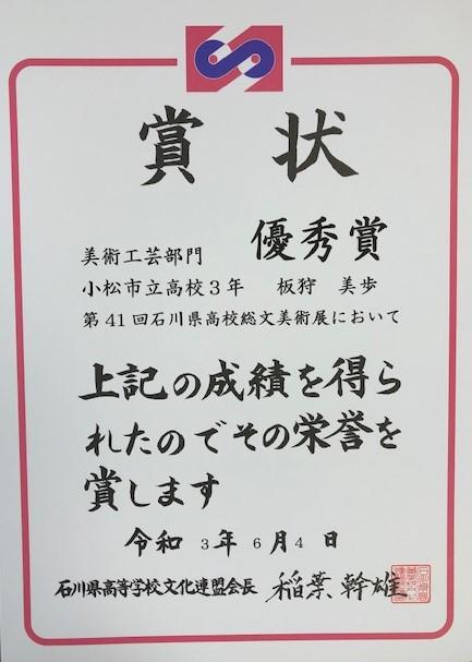 先日、部活動の方からお知らせした、県総文における美術部の賞状が届きました。松本さんは最優秀賞を、板狩さんは優秀賞を、長岡君は佳作を受賞しました。毎日真摯に作品に向き合ってきた結果だと思います。おめでとうございます!