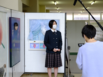 3年生最終登校日のこの日から「卒展」学校エントランスホール会場が始まりました。本会場では、卒業制作作品だけでなく、第2制作として作られた作品も展示しています。昼休み時と、その後の2回ギャラリートークが行われ、関わった先生方や、同級生、後輩たちが見守る中、作者は一人ひとり制作意図などを発表しました。展示期間は卒業式の3月2日までです。