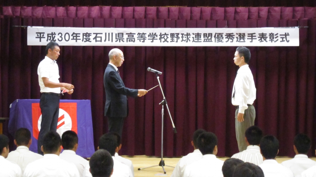 8月29日(水)に平成30年度石川県高等学校野球連盟優秀選手表彰式が金沢市で行われ、各校野球部3年生から29名が選ばれ、賞状と盾が贈呈されました。本校野球部主将の若林圭太郎君も受賞しました。