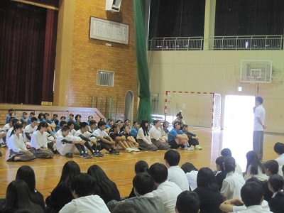 8日(月)7限終了後、体育館に全校生徒が集合し、インターハイ全国大会出場を決めたハンドボール部や、夏の甲子園を目指し地区予選に出場する野球部などの壮行会がありました。盛んな声援の中、選手たちは決意新たに健闘を誓っていました。最後はサッカー部の応援で締めました。
