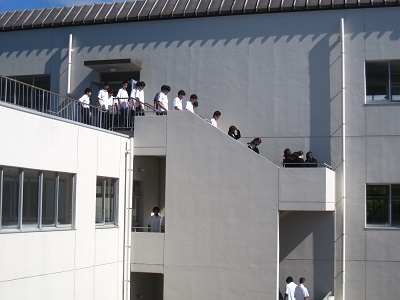 25日(火)7限目全学年を対象に地震を想定した避難訓練が行われました。生徒は整然と行動し、昨年と同じ時間で点呼を終えました。消防の方から、地震時には建物の高さの半分まで(4階建ての本校では壁から6~7メートルの所まで)割れたガラスが落ちてくるので特に注意することなどのお話がありました。