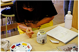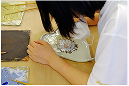 中間考査最終日であるこの日の午後、毎年恒例の芸術コース美術専攻1年生の九谷焼実習を能美市の九谷焼陶芸館で行いました。今回は、5月に制作した成形作品に絵付を行うもので、青(緑)・黄・紫・紺青・赤の「九谷五彩」を使い、焼き上がった時の彩をイメージしながら作業をしました。