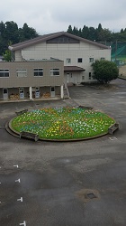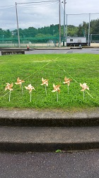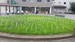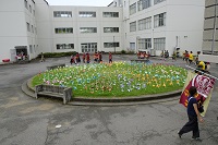 今年60周年を迎えた市高。全校生徒・全職員で、「風を巻き起こし、それぞれの花を咲かせ、未来に向かって歩んでいこう」という気持ちを込めて、かざぐるまを1本ずつ作り、部室前ロータリーに約650本を展示しました。一つの風花になる予定でしたが、当日、あいにくの雨。