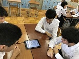 教材は『伊勢物語 芥川』。まず予告ムービーで、生徒達は本時の学習内容をイメージ。ペアで人物の心情を考え、タブレット端末に書き込み、全員で共有しました。