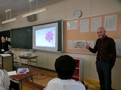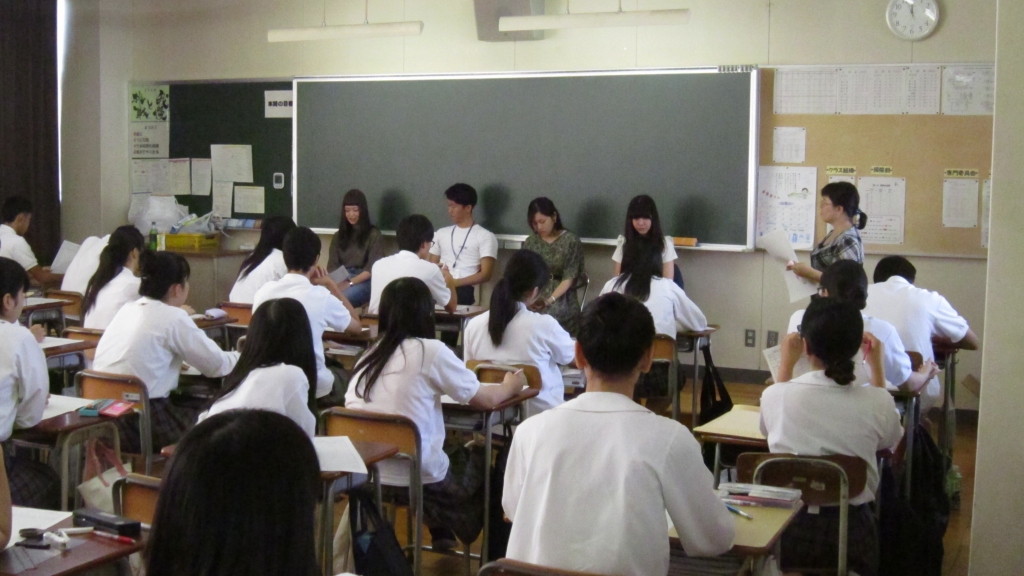学校公開日のこの日、午前中を授業公開、午後からは本校OBを招いて「仕事パネルディスカッション」そして「ロシア・アンガルスク市青少年交流事業 報告会 」が行われました。「仕事パネルディスカッション」では、社会人になったOBから、高校生の頃の自分や現在の自分についてを語って頂きました。