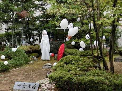 雨の中模擬店も頑張りました(2年) 中庭に白い河童?アートです