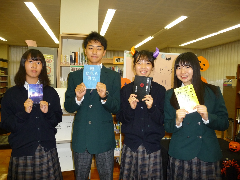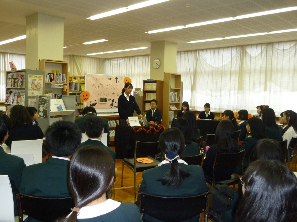 昨日放課後、図書館にて校内ビブリオバトル大会を開催しました。今回も図書室はハロウィン風に飾り付けをし、4人のバトラーがそれぞれイチオシ本を紹介、最後に一番読みたくなった本にギャラリー(来場者全員)が投票してチャンプ本が決まりました。